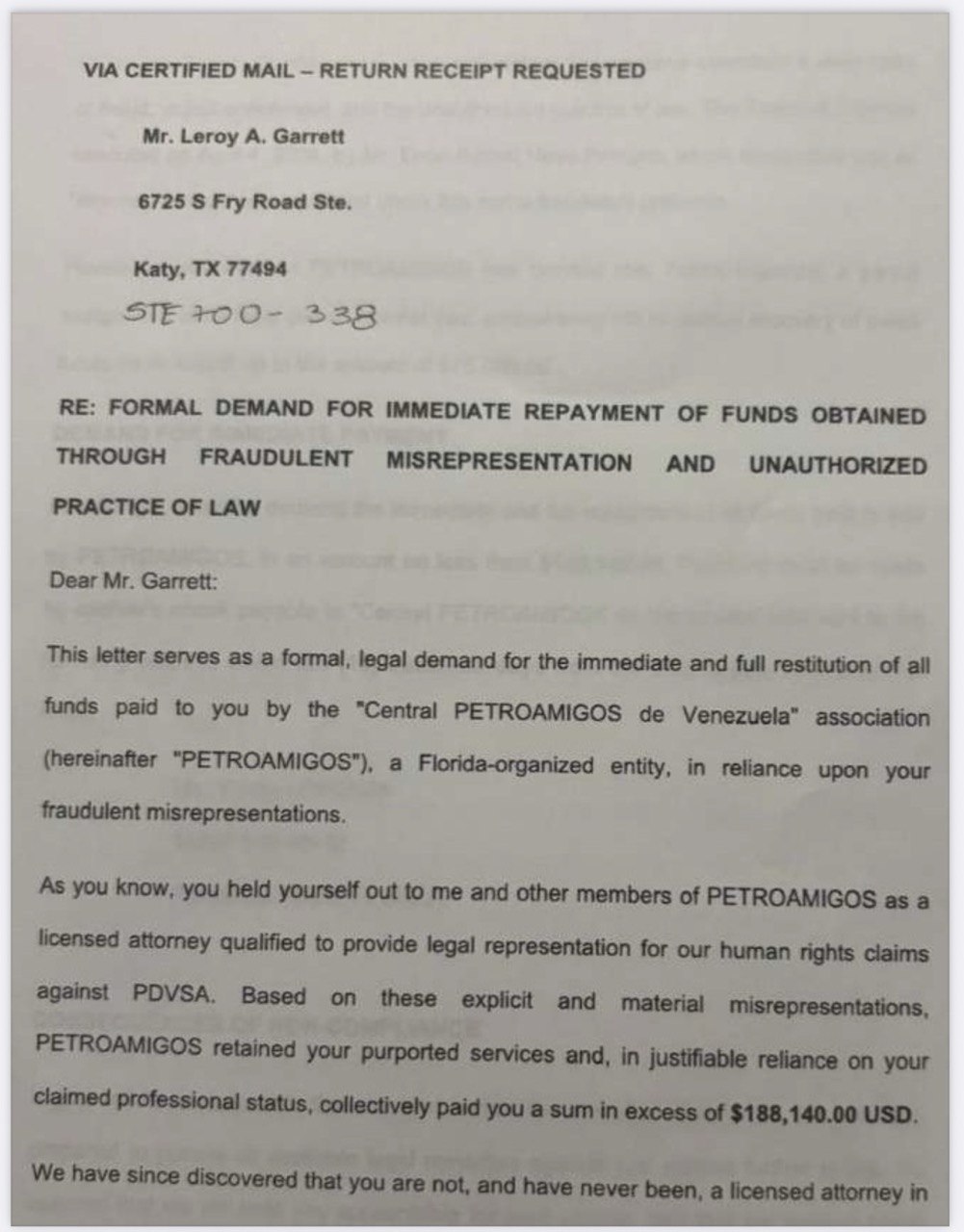Como sabe, usted se ha ofrecido a mí y a otros miembros de PETROAMIGOS como abogado con licencia, calificado para proporcionar representación legal para nuestras reclamaciones de derechos humanos contra PDVSA. Basándose en estas tergiversaciones explícitas y materiales, PETROAMIGOS retuvo sus supuestos servicios y, confiando en su estatus profesional reclamado, le pagó colectivamente una suma superior a $188.140,00 USD.