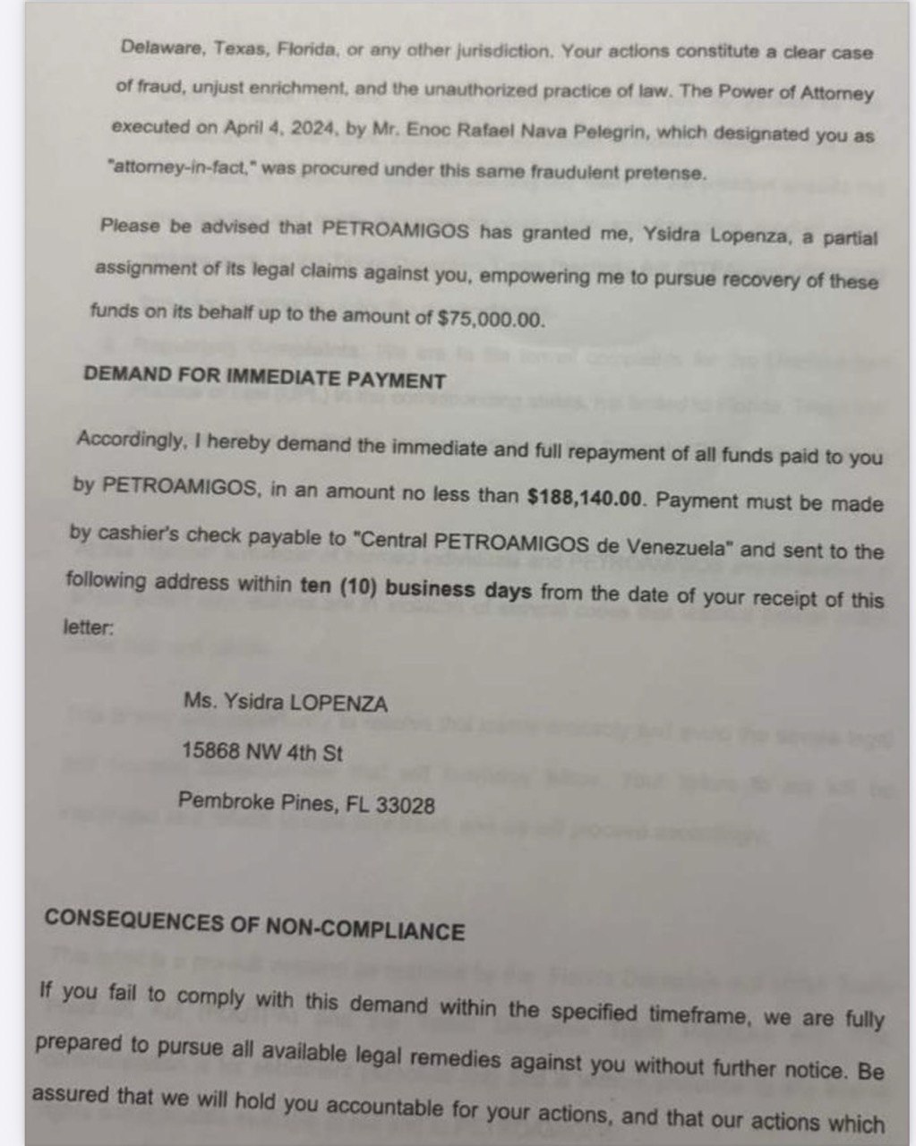 En consecuencia, por la presente exijo el reembolso inmediato y completo de todos los fondos pagados a usted por PETROAMIGOS, por un monto no inferior a $188.140,00. El pago debe hacerse mediante cheque de caja a nombre de «Central PETROAMIGOS de Venezuela» y enviarse a la siguiente dirección dentro de los diez (10) días hábiles a partir de la fecha de recepción de esta carta: