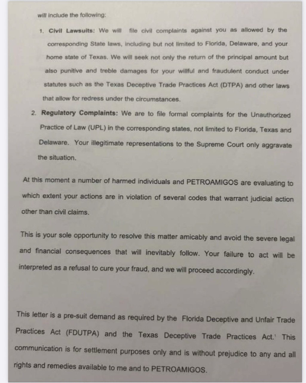 Esta carta es una demanda previa a la demanda según lo requerido por la Ley de Prácticas Comerciales Engañosas y Desleales de Florida (FDUTPA) y la Ley de Prácticas Comerciales Engañosas de Texas. Esta comunicación es solo para fines de conciliación y no prejuzga todos y cada uno de los derechos y recursos disponibles para mí y para PETROAMIGOS.