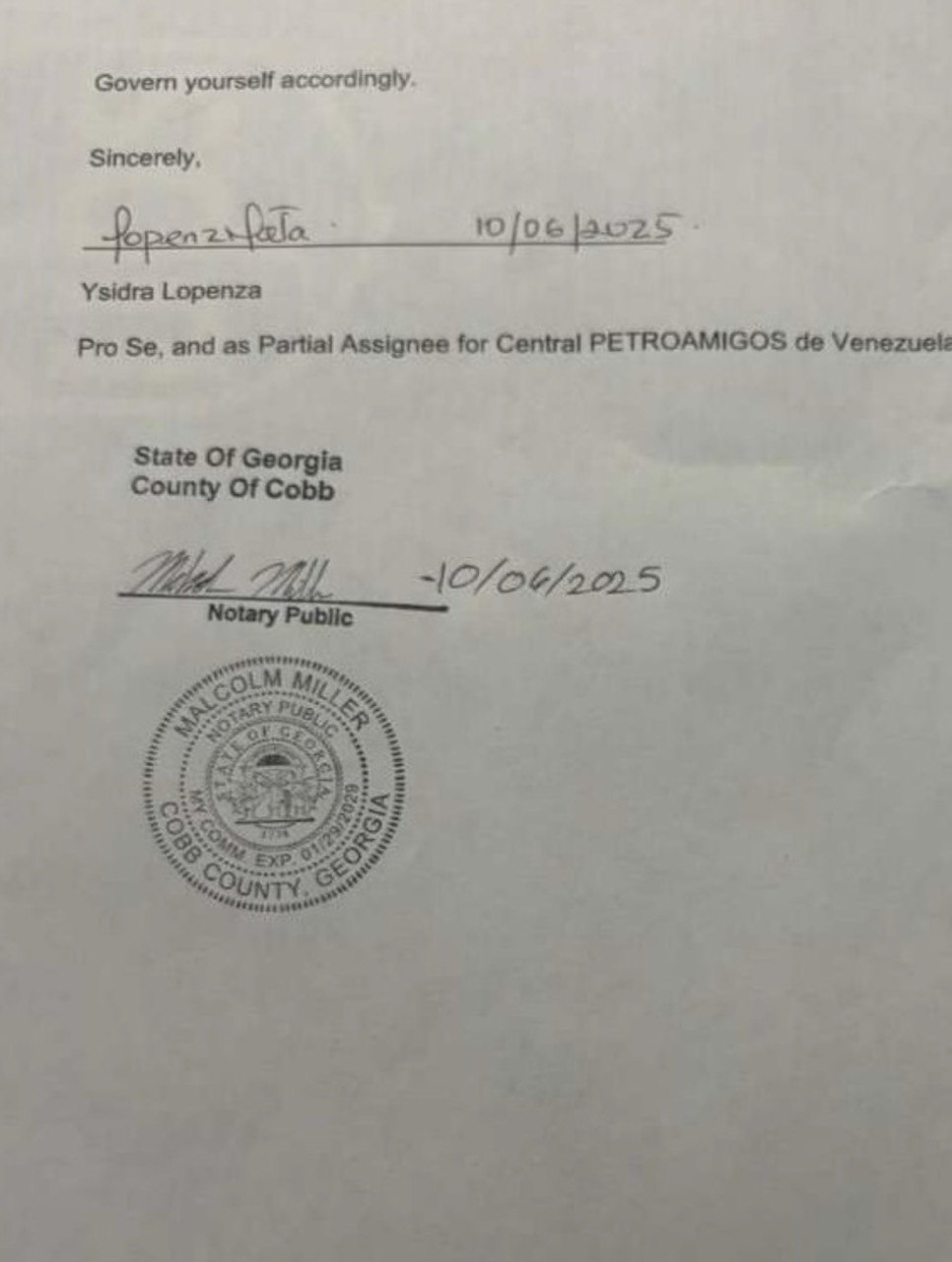 Tenga en cuenta que PETROAMIGOS me ha concedido a mí, Ysidra Lopenza, una cesión parcial de sus reclamaciones legales contra usted, lo que me autoriza a recuperar estos fondos en su nombre hasta la cantidad de 75.000,00 dólares.